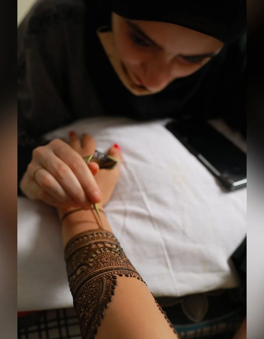 A little peek into my world! Here you can see my freehand artistry in action, the satisfying process of creating my silky smooth organic henna paste, and the joy I share with my wonderful clients.