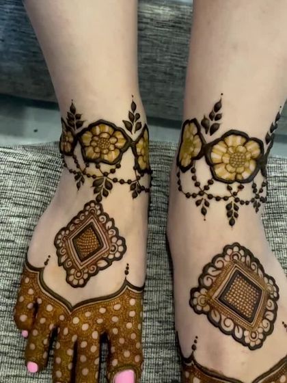 Don't forget your feet. We offer a range of beautiful mehndi designs for the feet, from simple and delicate patterns to full coverage art that complements your bridal look perfectly.