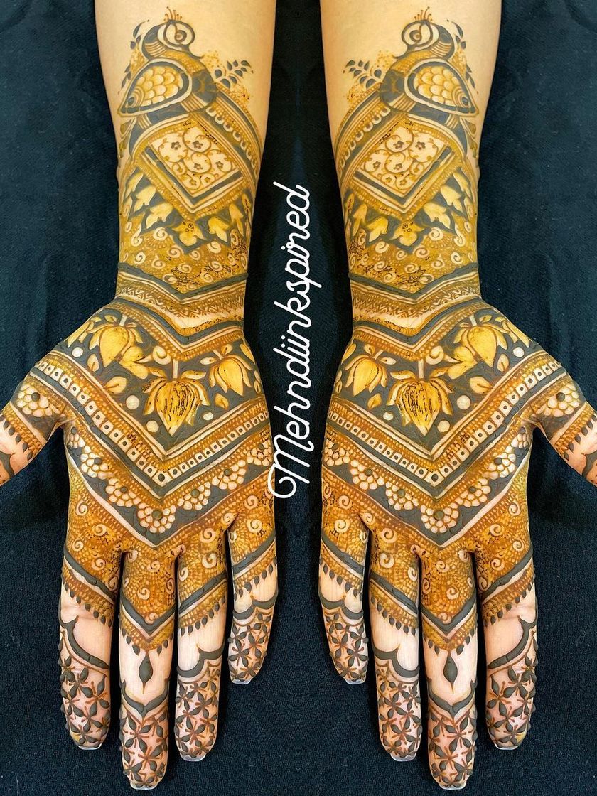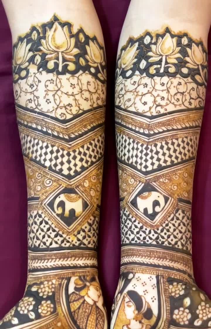 This collection showcases our expertise in full, traditional bridal mehndi. We create dense, detailed patterns that cover the hands and arms, featuring classic motifs like peacocks, lotuses, elephants, and architectural jharokhas for a timeless look.