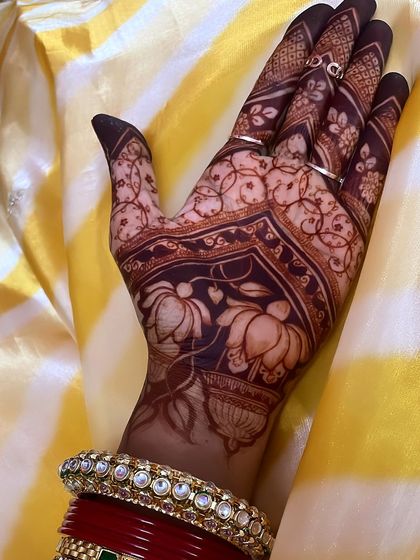 We believe your mehndi should be as unique as your love story. We work with you to incorporate personal elements like bride and groom portraits, names, special dates, or even a quirky logo that is meaningful to you.