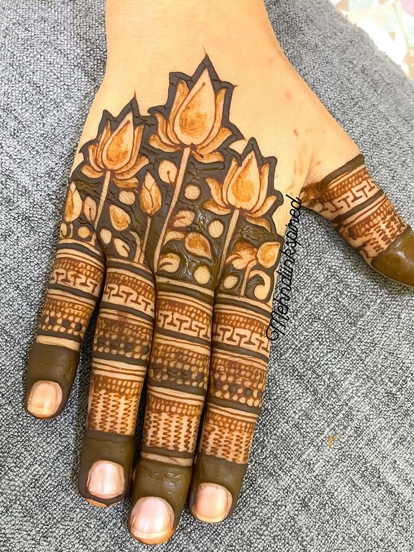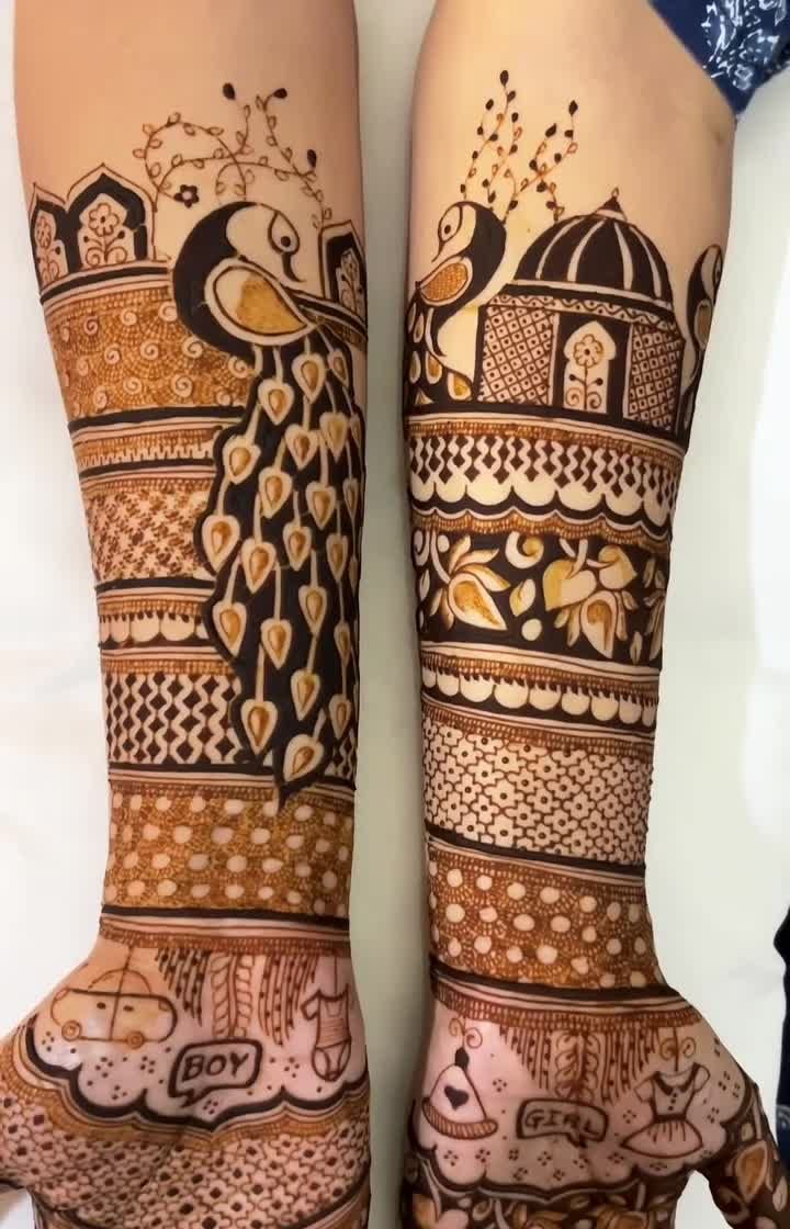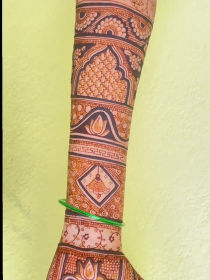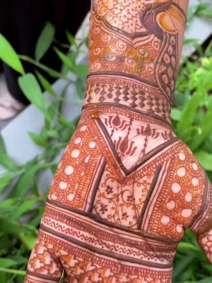 For those who love detailed and elaborate henna, we specialize in full-coverage designs that extend from hand to arm. These patterns feature a rich mix of traditional motifs like peacocks, florals, and architectural elements, perfect for brides or grand celebrations.
