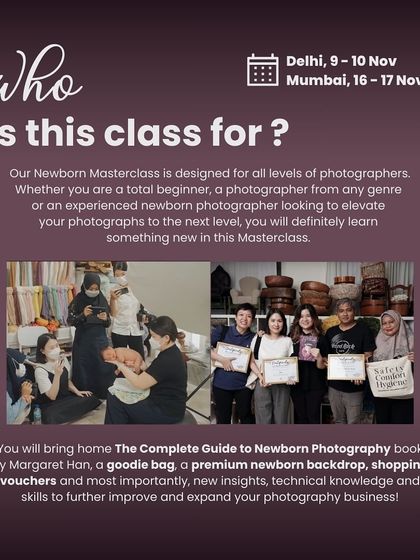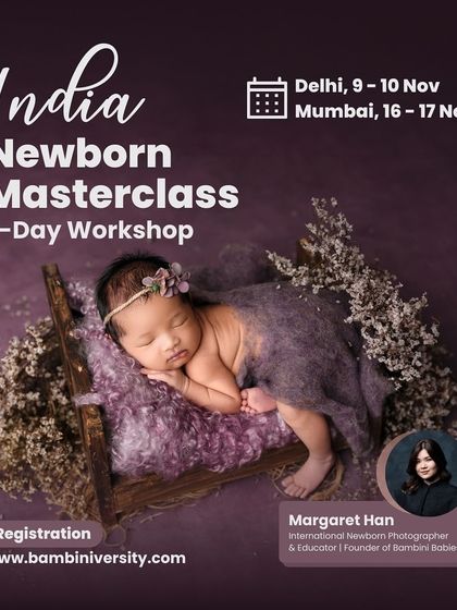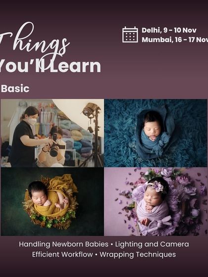 I teach hands-on workshops on maternity and newborn photography, safety techniques, creative lighting, and how to build a photography business, with open Q&A and a supportive community for all skill levels.
