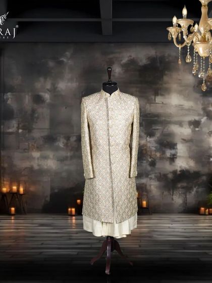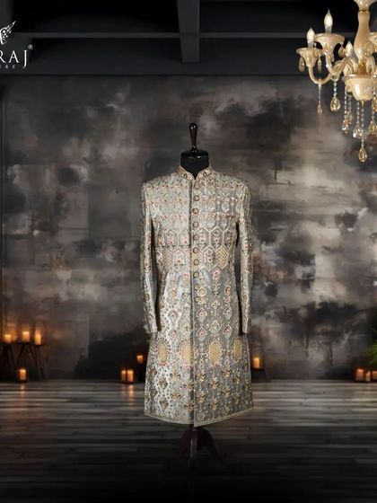 - Sherwanis: My sherwanis are all about that classic regal feel. You’ll see everything from off-white silk with Persian touches to bold gold and velvet in deep shades like emerald and maroon. The hand-embroidered details, like zardozi and meenakari, really stand out and make you feel shaadi-ready (ready for the wedding).