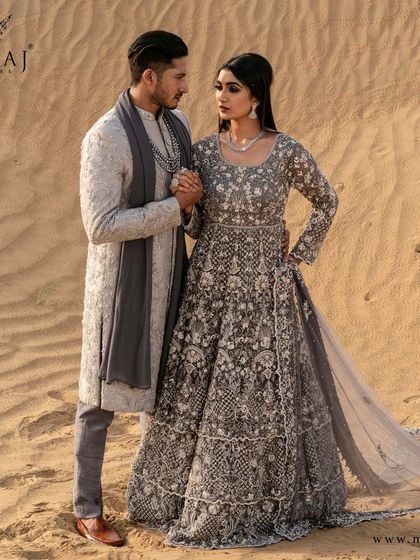 We design groom wedding outfits including sherwanis, suits, tuxedos, and Indo-Western styles, with custom embroidery and matching options for couples.