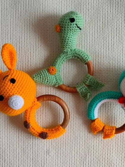 I make these soft and safe items especially for newborn babies and small children. Everything is 100% handmade by me using gentle cotton or velvet yarn and is completely plastic free, making them perfect for your little ones to play with and wear. You will find soft shoes, breathable caps, and a variety of cute animal rattle toys with wooden rings.