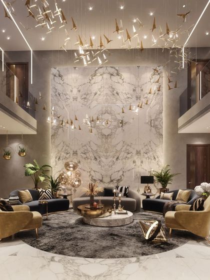 - Living rooms with double-height ceilings, plush sofas, and cozy spots for family hangouts