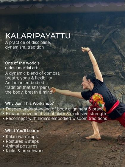 I teach movement workshops that blend Kalaripayattu martial art techniques, animal postures, and breathwork with yoga, open to all levels and offered both online and in-person.