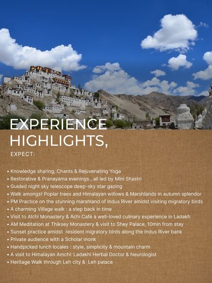 Journey with me to the Himalayan desert landscapes of Leh. These retreats combine daily yoga and meditation with cultural immersion, including visits to ancient monasteries, meetings with scholar monks, and stargazing, all while staying in serene luxury.