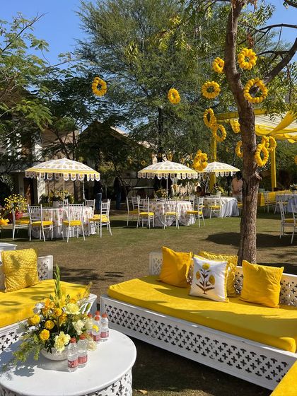 Blending Cultures & Styles - We mix South Indian saree Haldi setups, Rajasthani touches, and English floral Indian wedding vibes.