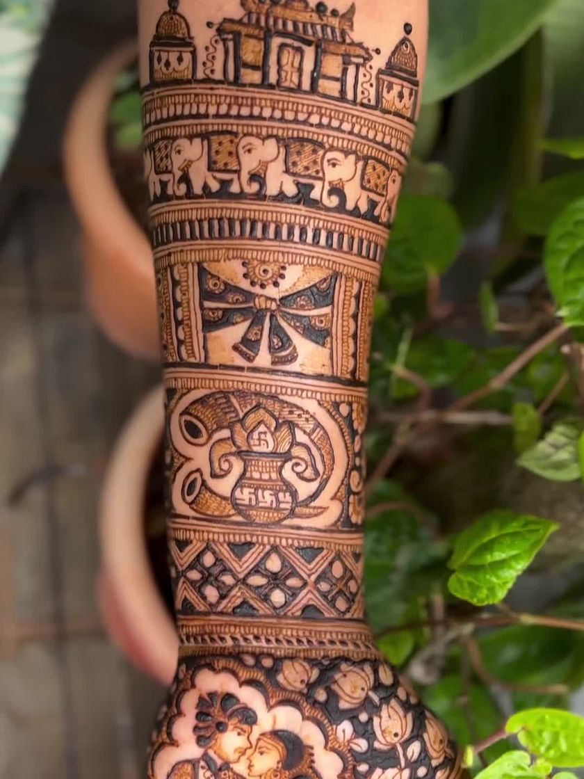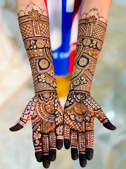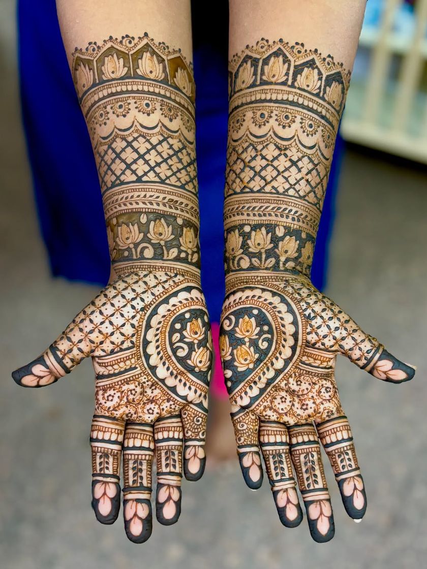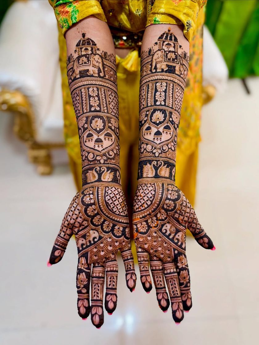 Explore my gallery of full-coverage bridal mehendi for hands, extending from the fingertips to the elbows. These designs are rich in detail, featuring a blend of traditional motifs like peacocks, elephants, lotuses, and intricate jaali patterns, all created with my skin-safe, organic henna for a deep, dark stain.