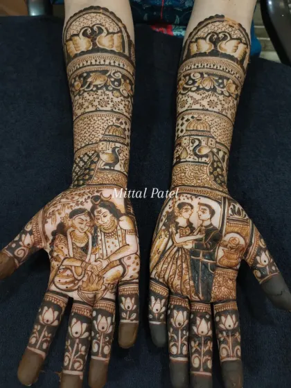 - Execution: Main intricate elements (palms/arms) done by Mittal Patel; repetitive filling or feet may be assisted by a junior artist.
