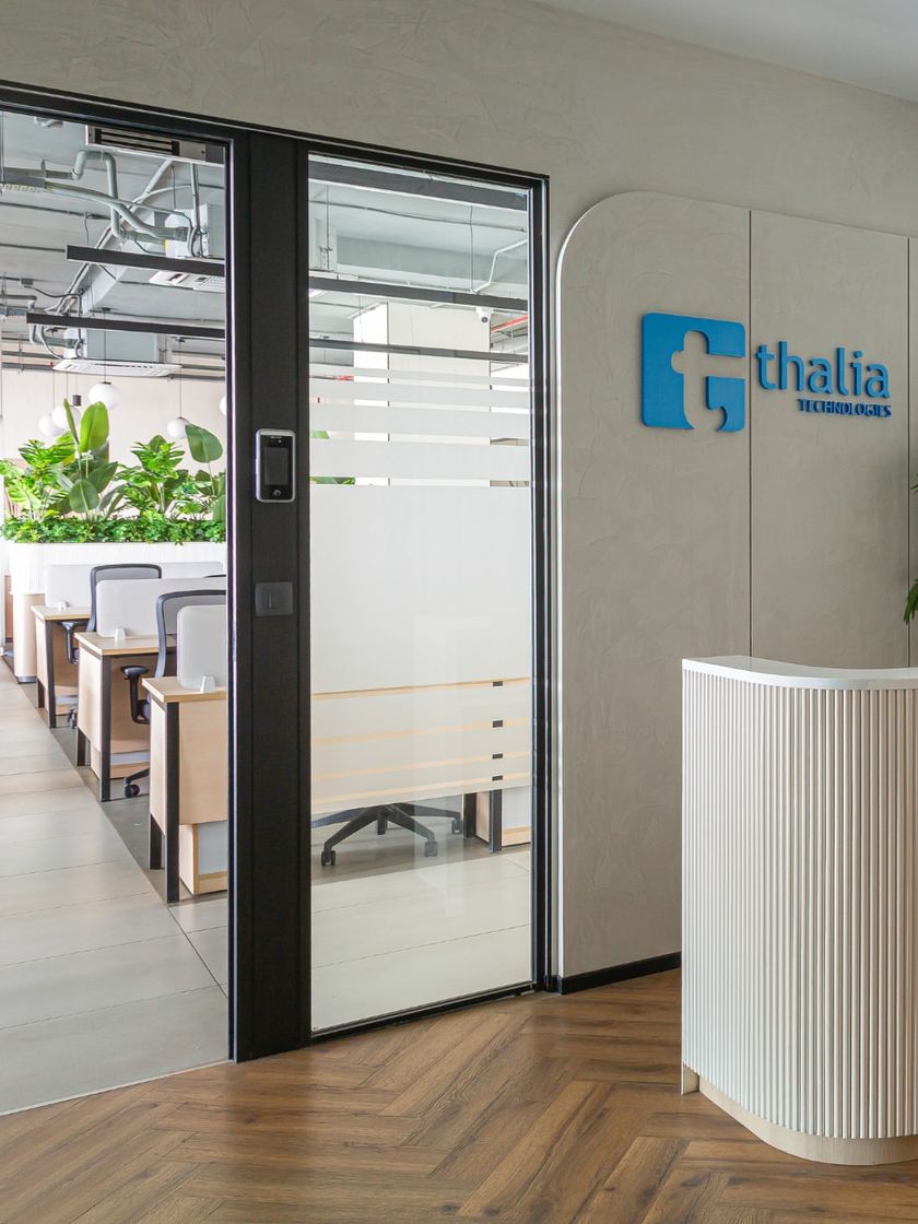 For Thalia Technologies, a fast-moving tech firm in Dadar, I designed a 5,000 sq. ft. office that prioritizes people. The design is built on an open, light-filled layout with a variety of zones for different work styles, from focused individual workstations to dynamic areas for team collaboration. The material palette of natural wood, concrete finishes, and integrated greenery creates a calm, productive atmosphere that supports the team throughout their day.