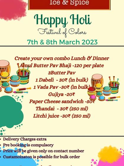 We make fresh, homemade pure veg festival and seasonal food like fasting thalis, undhiyu, Holi snacks, and Alphonso aam ras, all cooked with pure ghee or sunflower oil; pre-booking and local delivery available.