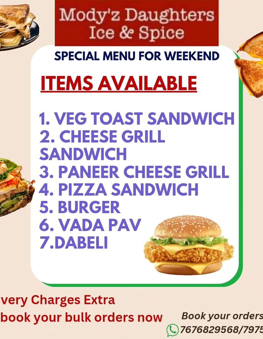 I offer a variety of popular Mumbai-style street food and snacks, perfect for parties or a quick bite. The menu includes items like vada pav, dabeli, pav bhaji, and different types of sandwiches, all prepared fresh and hygienically.