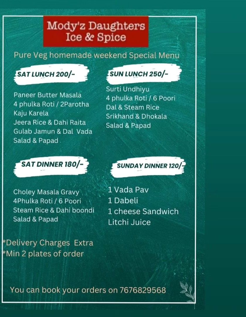 I prepare a different homemade vegetarian thali menu every Saturday and Sunday for lunch and dinner. Expect complete meals with items like paneer sabzi, dal, rice, and phulka roti, all made fresh to order.