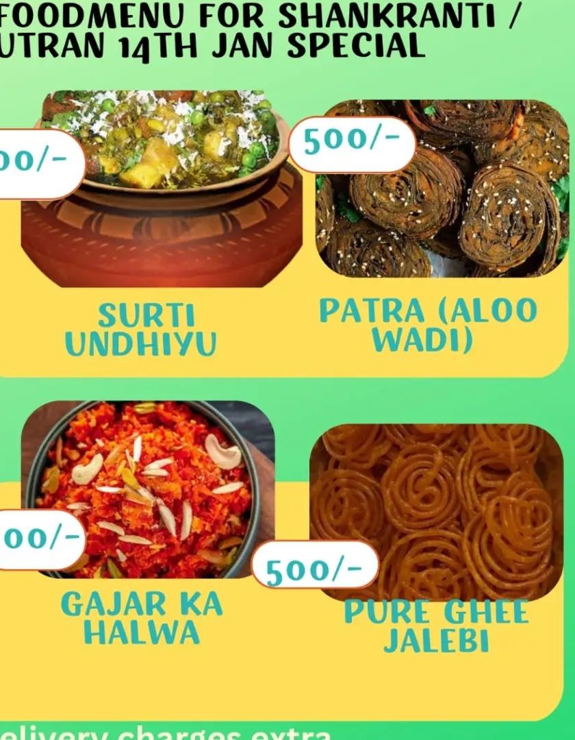 You can order some of my signature dishes by the kilogram or litre, ideal for stocking up or for large family events. This includes seasonal specials like Surti Undhiyu in winter and pure Hapus Aam Ras in summer, along with various sweets.