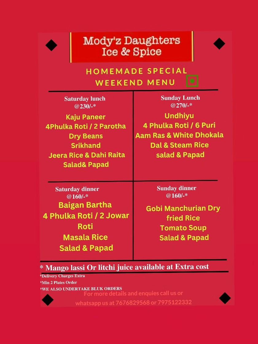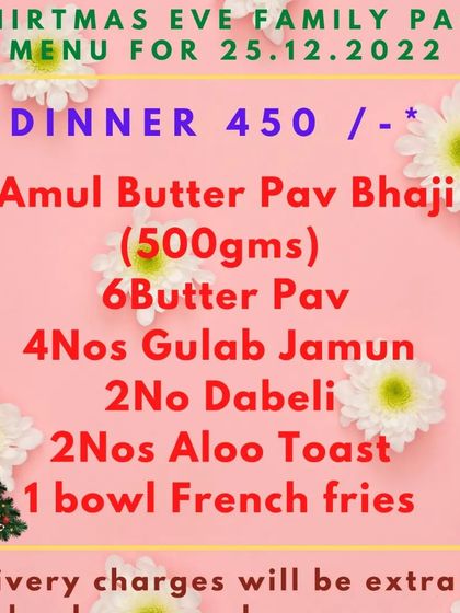 Take a break from the kitchen with our special weekend lunch and dinner menus, featuring a variety of full meals. We also offer family packs and party snacks like Pav Bhaji, Dabeli, and sandwiches for your gatherings.
