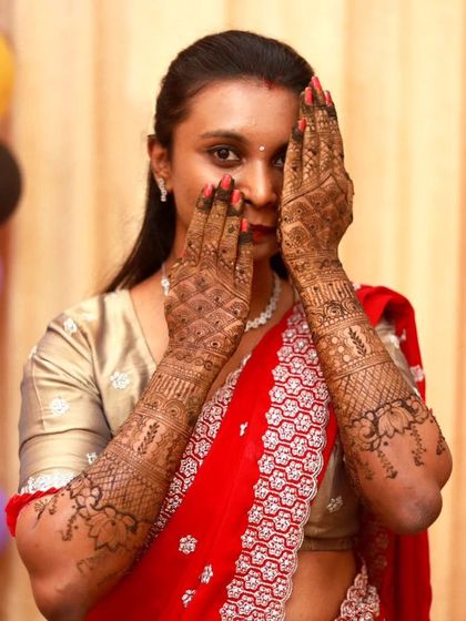 We specialize in creating intricate and personalized bridal mehendi designs that incorporate traditional motifs like peacocks, elephants, and floral patterns. Our designs can include special elements like bride-groom depictions, initials, and significant dates.