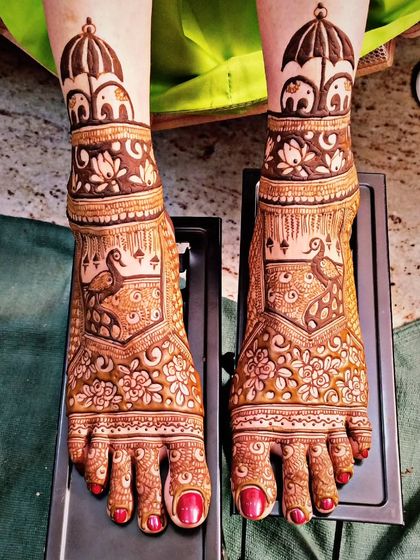 - Intricate Indian henna patterns with raja-rani, peacocks, jaali, and lotuses