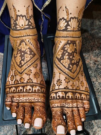 Complete your traditional look with beautiful mehndi designs for your feet. I create intricate and elegant patterns that complement your hand mehndi, from simple trails to full-coverage bridal designs, ensuring you are adorned from head to toe.
