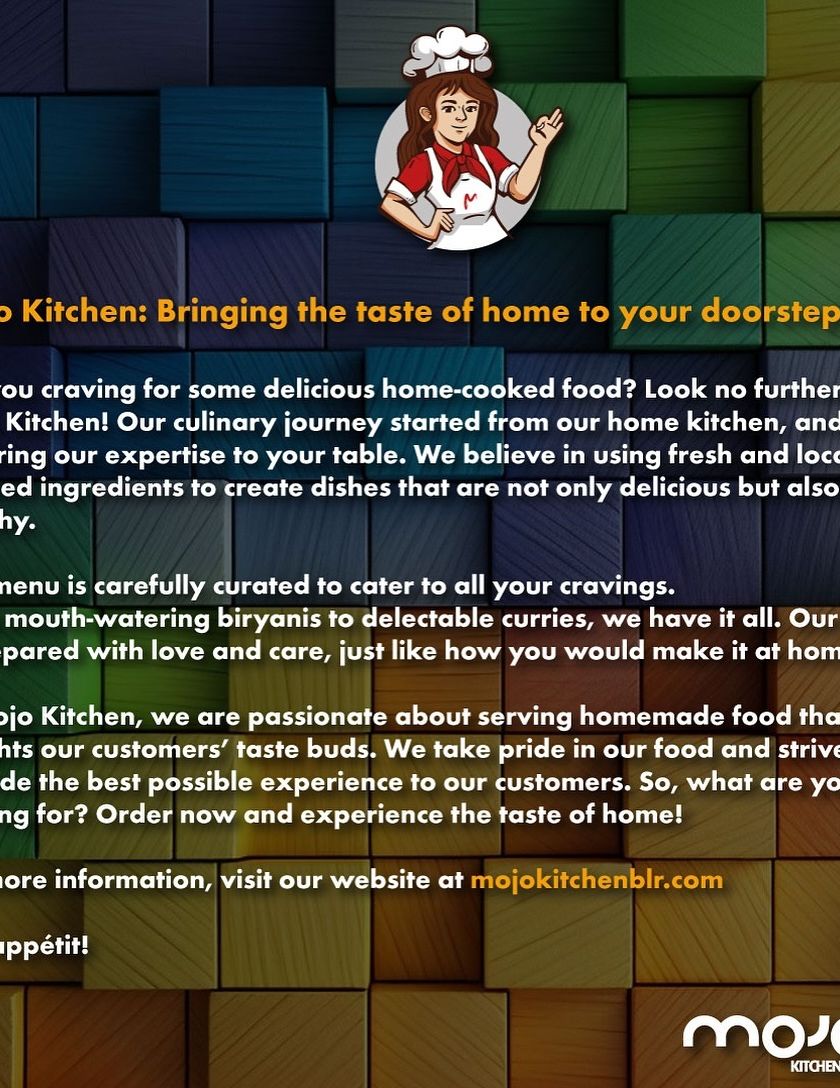 Mojo Kitchen started with a simple passion for authentic, home-cooked food. This is my journey of bringing the taste of home right to your doorstep in Bangalore.