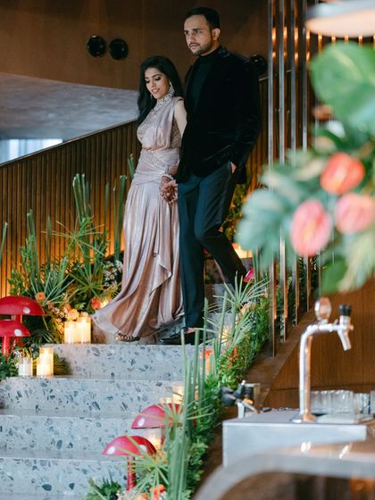 This Haldi ceremony was a bohemian dream, inspired by warm terracotta hues and earthy textures. We designed unique elements like personalized 'Promise Pillars' and used pampas grass, rattan furniture, and custom signage to create a perfect Pinterest-worthy vibe.