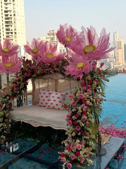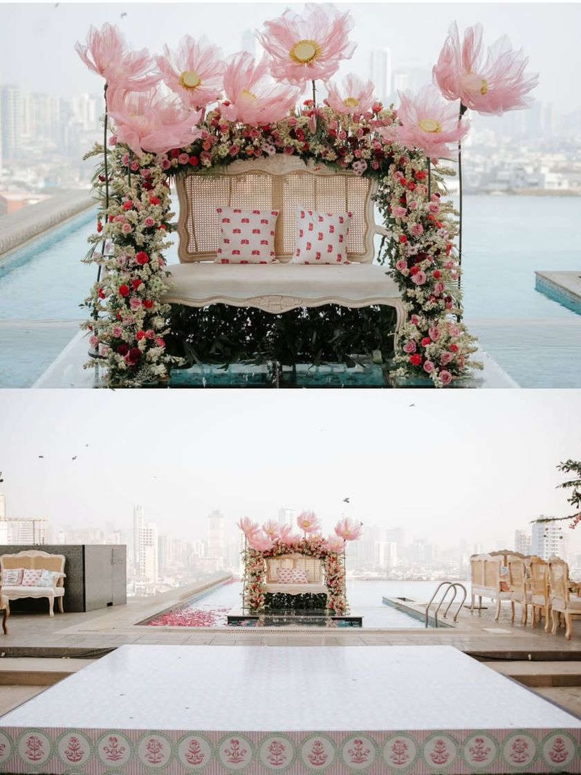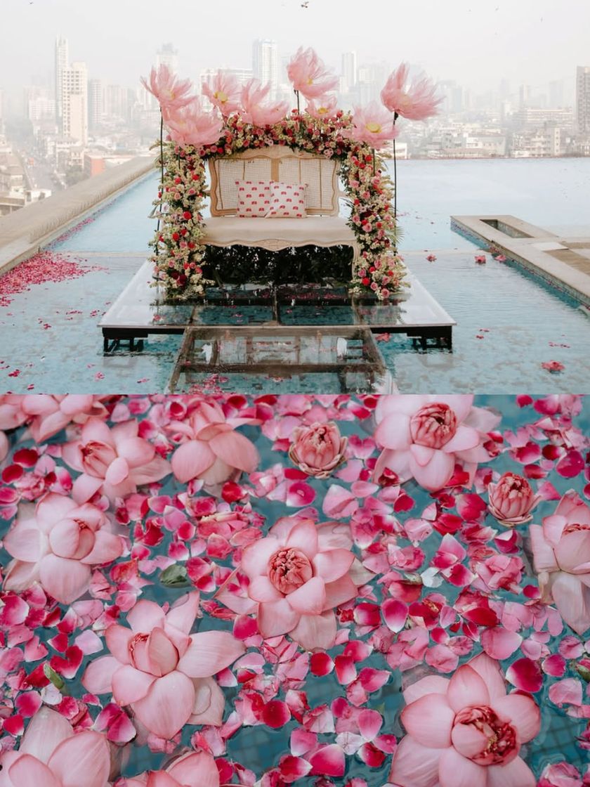 We created a 'Garden of Love' with a floating stage on a rooftop pool, surrounded by giant organza lotuses. This dreamyyy setup for a mehendi ceremony blends traditional motifs like fruits and brass urlis with a modern, ethereal aesthetic.