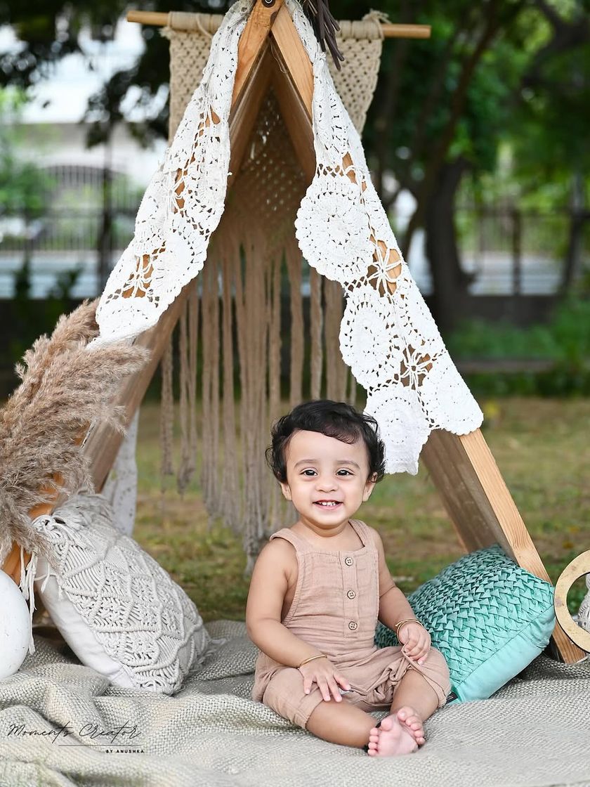 For families who love a natural, earthy aesthetic, I offer beautiful boho-themed shoots both in my studio and at outdoor locations across Delhi NCR. These sessions feature elements like lace teepees, macrame, pampas grass, and warm, neutral tones for a relaxed and authentic feel.