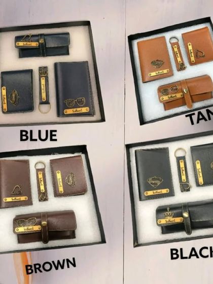 I have curated the perfect gift combos that are both practical and personal. These sets typically include a personalized wallet, keychain, passport cover, and eyewear case, all customized with a name and charm. Available in multiple premium colors, they come ready to gift in an elegant box.