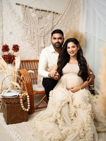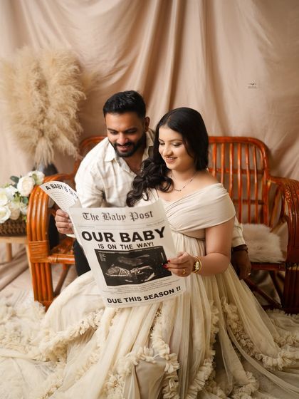 Everything happens in a cozy setup, with plenty of natural light and laidback vibes. You don’t have to bring much - I’ve got a wardrobe packed with maternity gowns, flowy dresses, and even sarees for those who want a more traditional touch. If you need hair and makeup, I can help set that up too. Props? Yup, I keep it fun with sonogram photos, custom newspapers, and chalkboards for those “Coming Soon” shots.