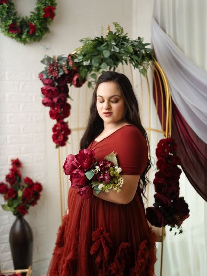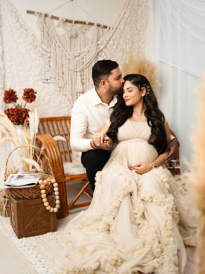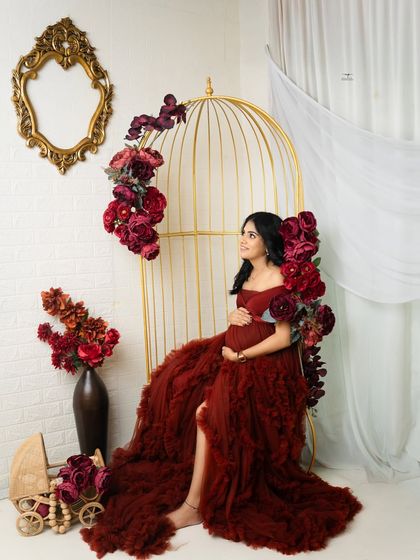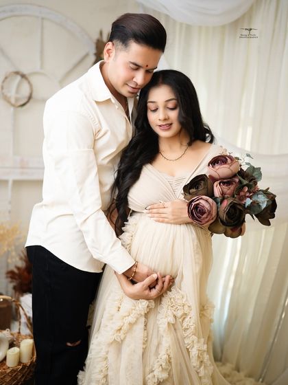We do maternity photoshoots in our Navi Mumbai studio with different themes, provide gowns and props, welcome family, and make short videos along with photos.