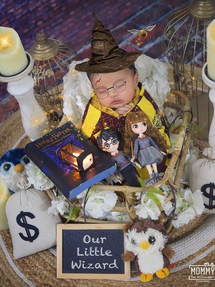 This is where we get creative. In my Gurgaon studio, I design unique themed setups for your baby, from celestial moons and rustic floral arrangements to fantasy worlds like Harry Potter. I also love creating special setups for festivals like Holi and Navratri.