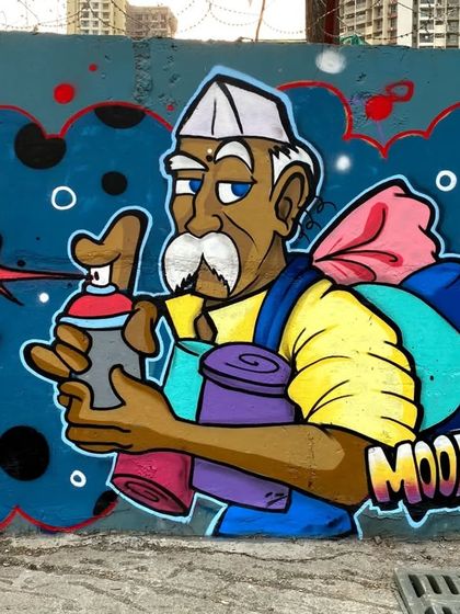 Whether it’s indoor graffiti murals for your bedroom, office, or a street art piece for cafes and public walls, I’ve painted them all. Big walls, small rooms, outdoor spaces - I work anywhere, even if scaffolding is needed or Mumbai ki baarish (Mumbai rains) make it tricky. Bas kaam khatam karna hai (Just gotta finish the job).