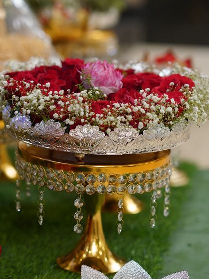 Our decorations feature ornate trays with gold/silver embellishments, dressed dolls in traditional attire, and carefully curated arrangements that enhance the ceremonial significance of your special occasions.