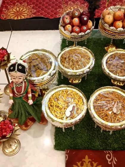 Seemantham is a beautiful ceremony, and I love making it extra special. I provide complete plate decoration services, including traditional elements like decorated coconuts and modern touches like elegant stands and dolls, to celebrate the mother-to-be.