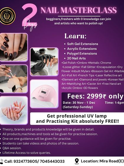 We teach practical nail extension and art skills with hands-on training, free pro kit, government certificate, and career support for all levels at affordable fees.
