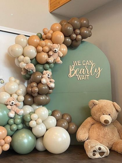 For baby showers, I do everything from teddy bear parties with cute “We can Bearly Wait” signs, to boho pampas looks with neutral balloons. If you want floral vibes, “Baby in Bloom” is always a hit.