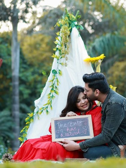 Our East Delhi maternity studio in Gagan Vihar is pretty massive, with 50+ setups, props like moon swings and teepees, and a wardrobe full of flowing maternity gowns. Want outdoor shots in natural light? That’s sorted too. We even have fun props for birth announcements - chalkboards, baby shoes, ultrasound frames.