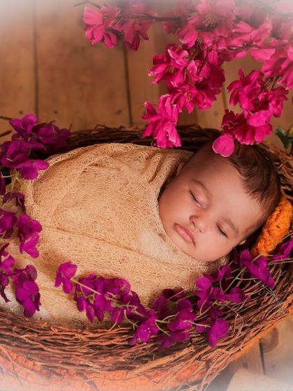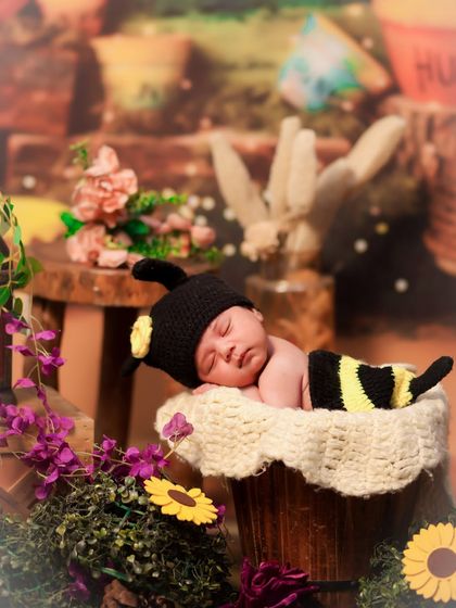 We specialize in themed newborn photography that captures your baby's earliest precious moments. Our sessions feature creative setups like snail, honeybee, caterpillar, and Krishna themes, complete with matching props and backdrops. Each shoot is carefully styled to create whimsical, cozy atmospheres that highlight your newborn's innocence.