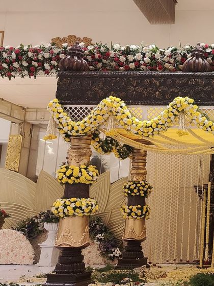 Weddings & Traditional Events - Floral wedding backdrops, mandaps, fabric draping, stage setups for haldi, mehendi, receptions.