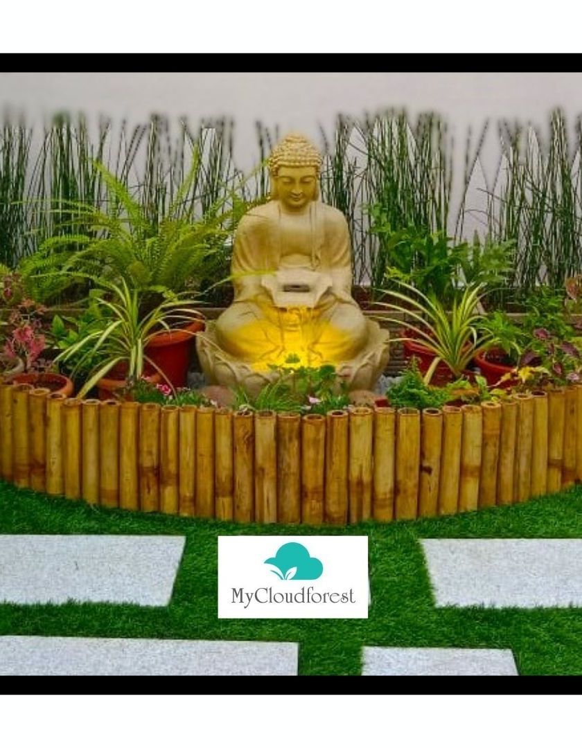 I create tranquil spaces designed for peace and mindfulness. These gardens often feature key elements like Buddha statues, gentle water fountains, and clean arrangements of white pebbles and stepping stones on a bed of soft artificial grass.