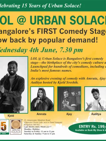 LOL @ Urban Solace - First comedy stage in Bangalore. Wednesdays explode with laughter, from fresh faces to big names.