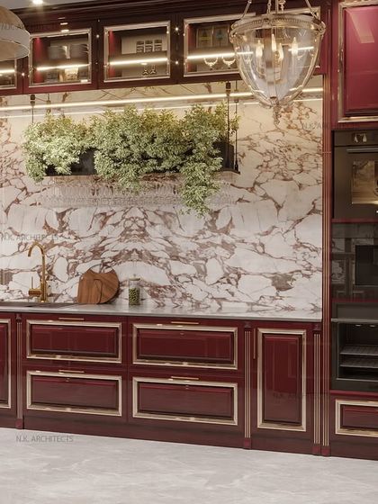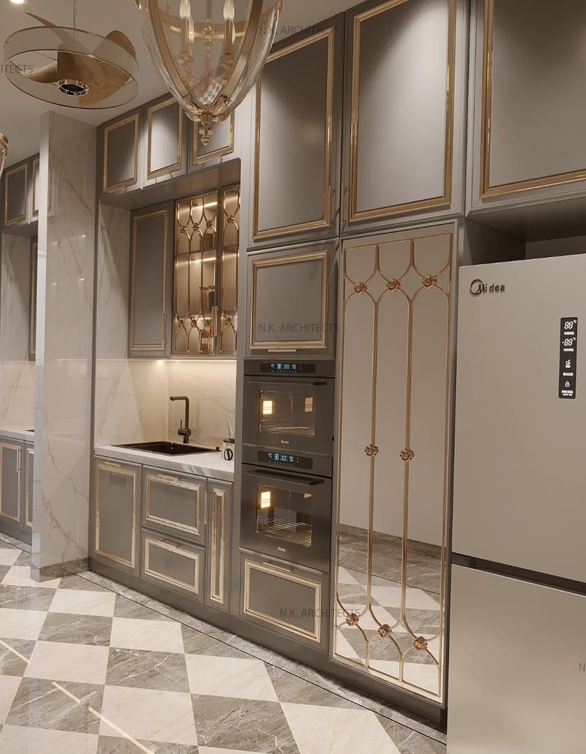 The kitchen is the heart of the home, and we design them to be both beautiful and highly practical. We focus on smart layouts, ample storage solutions like double pantries, and a rich material palette including marble, gold-inlay, and custom cabinetry to create a space that is a joy to cook and gather in.