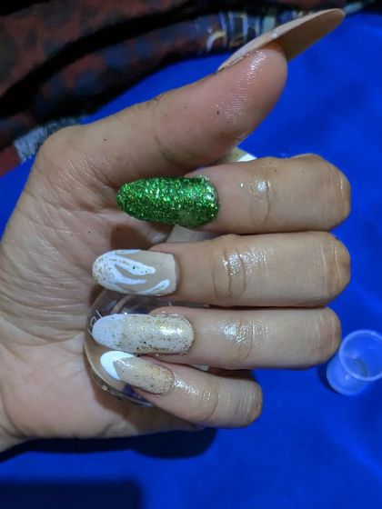Let's create something that stands out. I love doing custom hand-painted art, from vibrant patterns and cute designs to bold mixed-media looks with glitter and marble effects, all available through my home service in Bangalore.