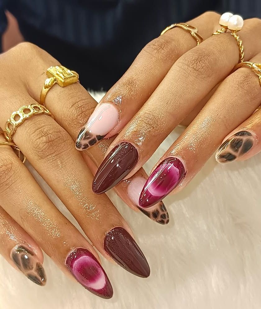 For those who love a little drama. This collection features rich, deep, and intense colors like wine red, glossy black, emerald green, and chocolate brown. Often paired with luxe gold accents, animal prints, or abstract art, these nails are perfect for making a powerful and sophisticated statement.