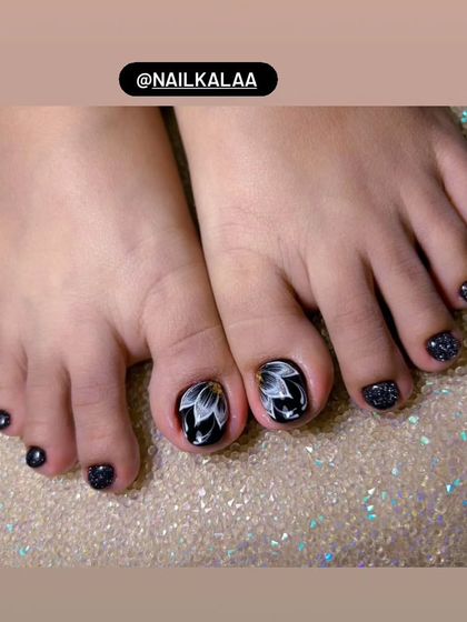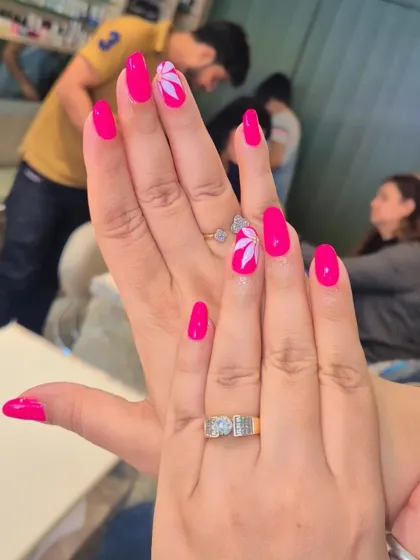 We do custom nail extensions, hand-painted nail art, gel polish, 3D designs, and refills for hands and feet at our Patel Nagar and Pitampura studios.