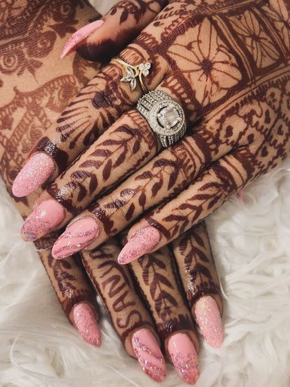 I specialize in creating bespoke nail extensions for your big day, from the roka to the reception. We'll design a set that complements your outfits and henna, featuring elegant 3D flowers, delicate crystals, and classic French ombré.