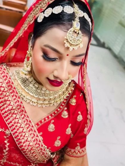 - Accessories: Professional pinning of Maang Tikka, Matha Patti, Nath, and fresh flowers.
