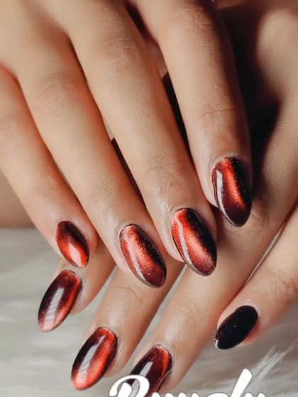 Explore the world of light-bending, metallic, and magnetic nail art. This gallery is all about shine, featuring designs made with chrome powders, cateye gel polish, and holographic effects. From deep, moody cateye to bright, reflective chrome, these techniques provide a futuristic and captivating finish.