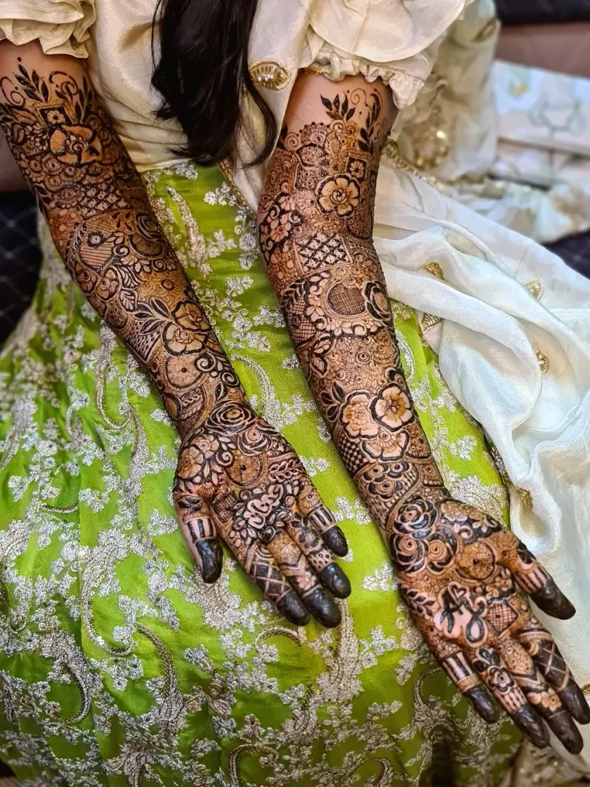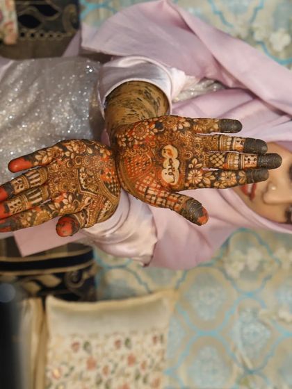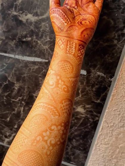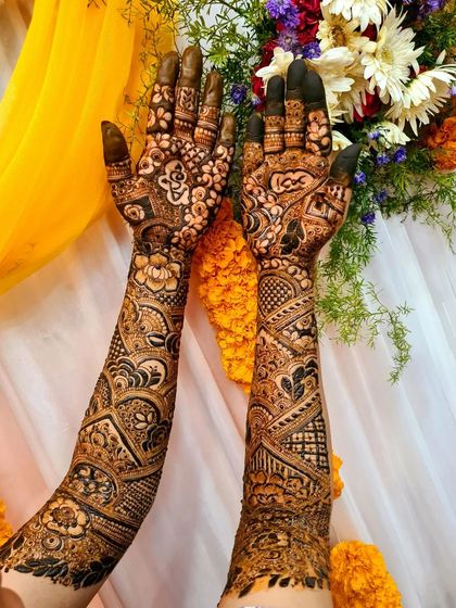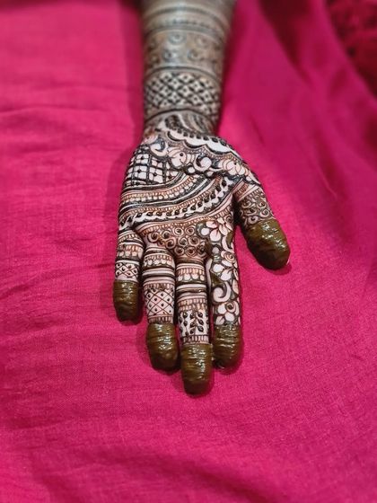 This gallery features my work on full bridal henna, from the fingertips to the elbows. You will see a variety of intricate patterns, including traditional motifs, floral designs, and personalized elements, all created with my special bridal blend cones for the darkest possible stain.